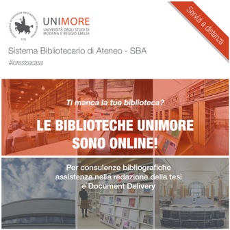 - Assistenza agli utenti: si ricorda che i bibliotecari sono a disposizione per assistenza alla ricerca bibliografica sia attraverso i contatti email consulenzabsi@unimore.it, sia attraverso il servizio Chiedi al bibliotecario
